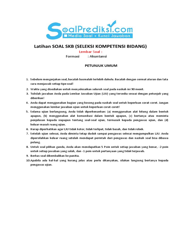 Contoh soal cpns sudah banyak beredar di internet. Sebelum kalian mengiuti ujian skb akuntansi, ada beberapa hal yang harus dan wajib diketahui supaya kalian dapat lulus serta mendapatkan hasil yang terbaik seperti latihan mengerjakan. Serta contoh soal skb 200 contoh materi soal skb seleksi kompetensi bidang cpns download 7 paket soal skb tkb tes cpns 2018 beserta jawaban info. Formasi kementerian lingkungan hidup 5. Latihan soal dan kunci jawaban skb akuntansi cpns.
