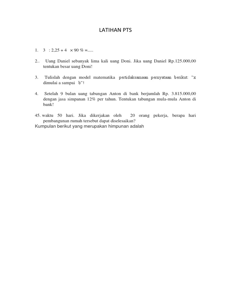 1 41 3 2 25 4 90 2 Uang Daniel Adalah Uang Doni Lima Kali Jika Uang Daniel Adalah Brainly Co Id from id-static.z-dn.net Manakah di antara kalimat berikut yang merupakan pernyataan ? Jun 16, 2021 · 3. 2𝑛 + 1 untuk 𝑛 ∈ 𝐴 adalah bilagan ganjil 2. "x begin a to b" … adalah. Sep 23, 2015 · 6 | p e n g a n t a r d a s a r m a t e m a t i k a 1. Tentukan tabungan awal anton di bank… 5. Baiklah sahabat, sekian yang dapat kami ulas pembahasan tentang soal online matematika kelas 7. Dari tabel diatas kita dapat menuliskan dalam bentuk pertidaksamaan yang akan menjadi seperti berikut :