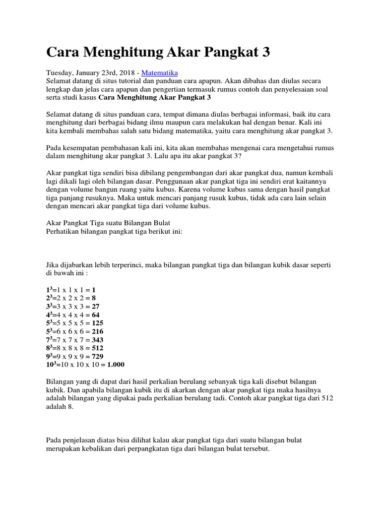 Sedangkan akar pangkat tiga dari suatu bilangan merupakan operasi. 3 pangkat kubik(pangkat 3) = 3 x 3 x 3 hasilnya 27, berarti akar pangkat 3 bilangan 27 adalah 3 bilangan 27 memiliki satuan 7. Karena cara ini akan menguntungkan sobat idschool dalam. Kebalikan pangkat dua adalah akar pangkat dua (√). Untuk bisa menemukan hasil dari akar pangkat tiga dari suatu bilangan bulat maka bisa dikerjakan menggunakan menghitung langsung atau memakai kalkulator.